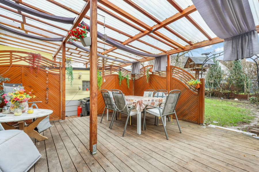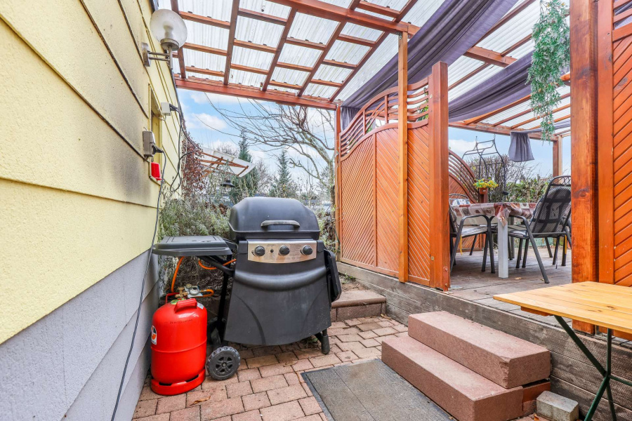 Das 305 m² große Grundstück ist pflegeleicht angelegt und bietet dennoch einen schön geschnittenen Garten, der sowohl über die Terrasse als auch über die Garage erreichbar ist. Die uneinsehbare Terrasse schafft zusätzliche Privatsphäre und vielfältige Nutzungsmöglichkeiten.