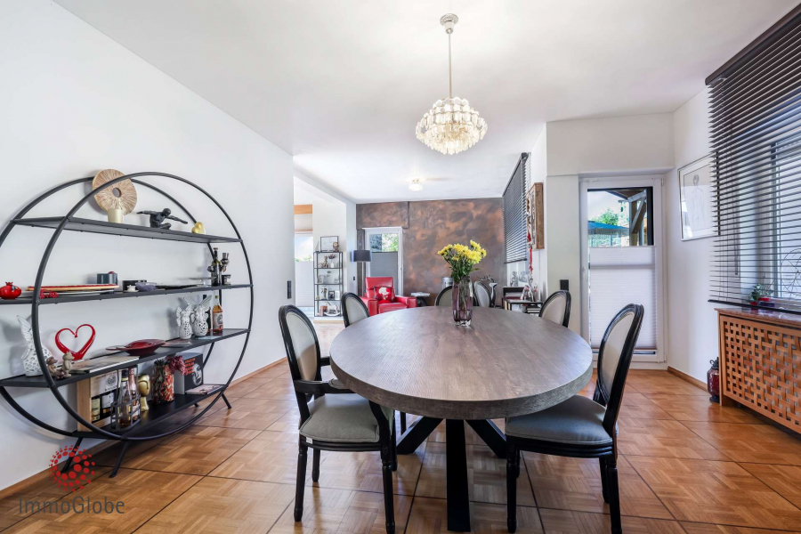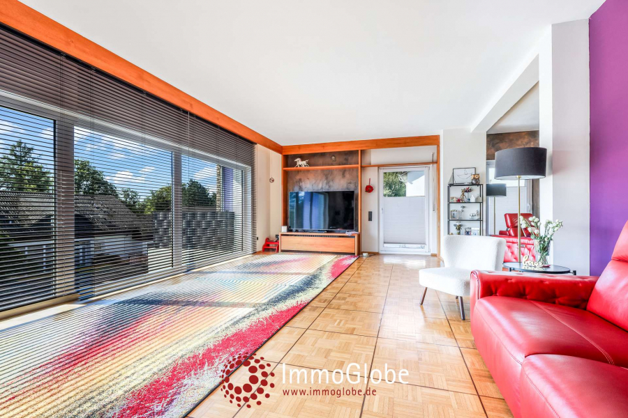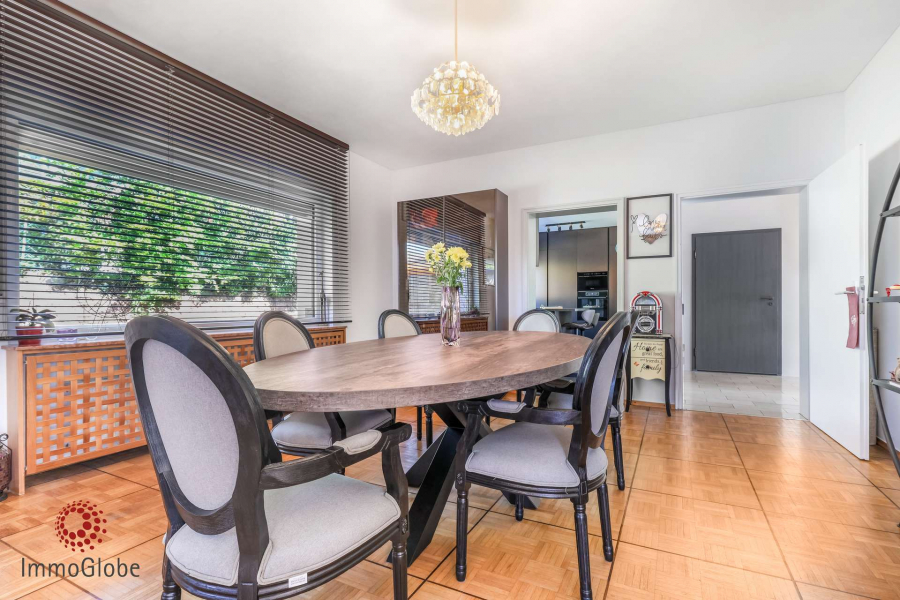 Große Fensterelemente im Wohn- und Essbereich sorgen für ein lichtdurchflutetes Ambiente und schaffen einen direkten Bezug zum Garten. Der edle Parkettboden im Wohnbereich wurde umfangreich aufbereitet.