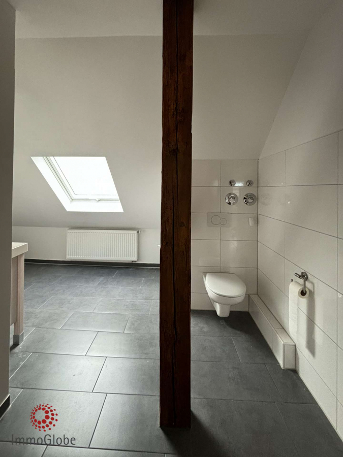Besondere Wohlfühlatmosphäre schaffen die Kombination aus Laminat- und Fliesenböden sowie die freiliegenden Dachbalken, die der Wohnung ihren besonderen Charme verleihen.
